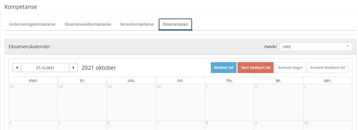 Under «Ansatte» og «Kompetanse» (i ViS) kan du legge inn blokkert tid. Velg arkfanen «Eksamensplan» og legg inn eller fjern blokkert tid.