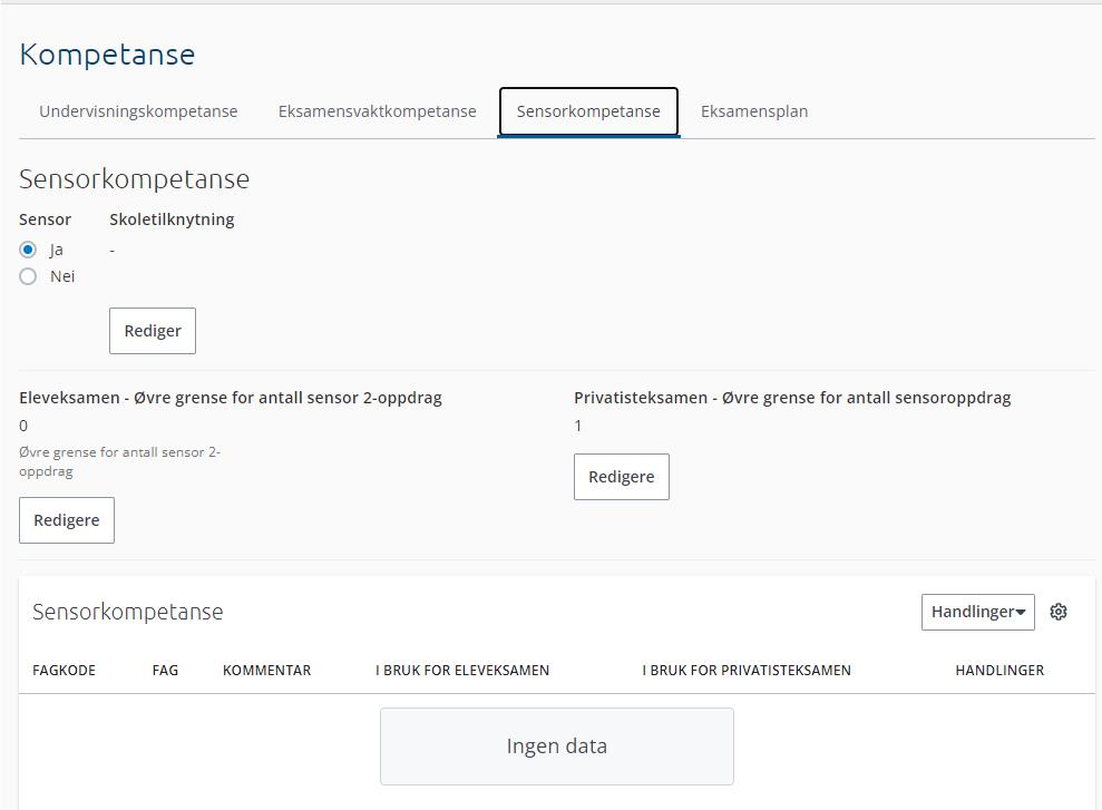 Under «Ansatte» og «Kompetanse» (i VIS) må du legge inn øvre grense for antall sensoroppdrag og sensorkompetanse. Velg arkfanen «Sensorkompetanse». Klikk på "Redigere"-knappen til venstre og legg inn antall privatistpartier. Klikk på knappen «Handlinger» til høyre for å legge inn nye fag eller fjerne fag. Skolen skal deretter godkjenne kompetansen.